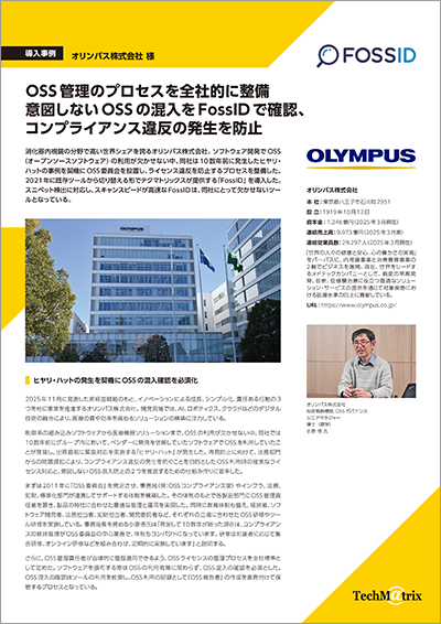 消化器内視鏡の分野で高い世界シェアを誇るオリンパス株式会社。ソフトウェア開発でOSS(オープンソースソフトウェア)の利用が欠かせない中、同社は10数年前に発生したヒヤリ・ハットの事例を契機にOSS委員会を設置し、ライセンス違反を防止するプロセスを整備した。2021年に既存ツールから切り替える形でテクマトリックスが提供する「FossID」を導入した。スニペット検出に対応し、スキャンスピードが高速なFossIDは、同社にとって欠かせないツールとなっている。